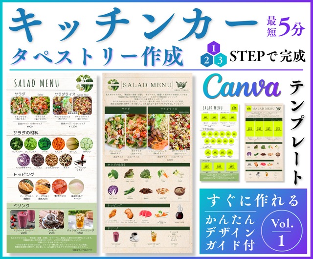 メニューの魅力をしっかり伝えたい飲食店向けに制作した、 縦型タペストリーデザインテンプレート(Vol.1) です。 サイズは 900×1800mm。 店頭のアイキャッチから、イベント出店・キッチンカーの装飾まで幅広く対応。 Canvaで編集できるため、デザイン経験がなくても安心してカスタマイズできます。 文字・写真を差し替えるだけで、 自店のメイン商品に合わせた“売れるタペストリー”が最短5分で完成します。 ■ 商品内容 お届けするPDF内に、以下のデータ一式を収録しています。 高解像度PDF(テンプレートリンク付き) Canvaテンプレート編集用リンク(無料版OK) 編集手順マニュアル (文字・色・写真の変更方法を初心者向けに丁寧に解説) 使用上の注意事項(商用利用範囲・禁止事項・罰則規定) ■ 特長 Canva無料版で編集可能 写真・文字・色を自由に差し替えOK サイズ比率そのままで大判印刷データを作成可能 店頭POP・イベント販売・キッチンカー出店など多用途で活躍 商用利用OK(※購入者本人のみ) ■ 使い方が不安な方へ 「説明を見ても使い方がわからない…」 「自分のお店に合わせてどう編集したらいい?」 という場合は お気軽にメッセージよりご相談ください。 Canvaの使い方やデザイン調整のアドバイスなど、丁寧にサポートします。 ■ 注意事項 テンプレートの再配布・転売は禁止となります。 商用利用は購入者ご本人のビジネスに限ります。 ■ ハッシュタグ #飲食店POP #タペストリー #サラダメニュー #飲食店販促 #キッチンカー #Canvaテンプレ #大判印刷 #店頭装飾 #ヘルシーメニュー #デザインテンプレート