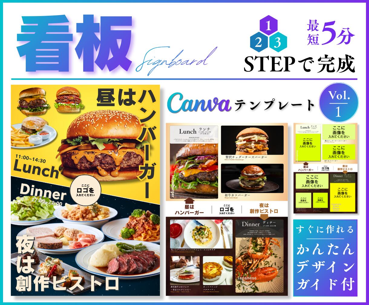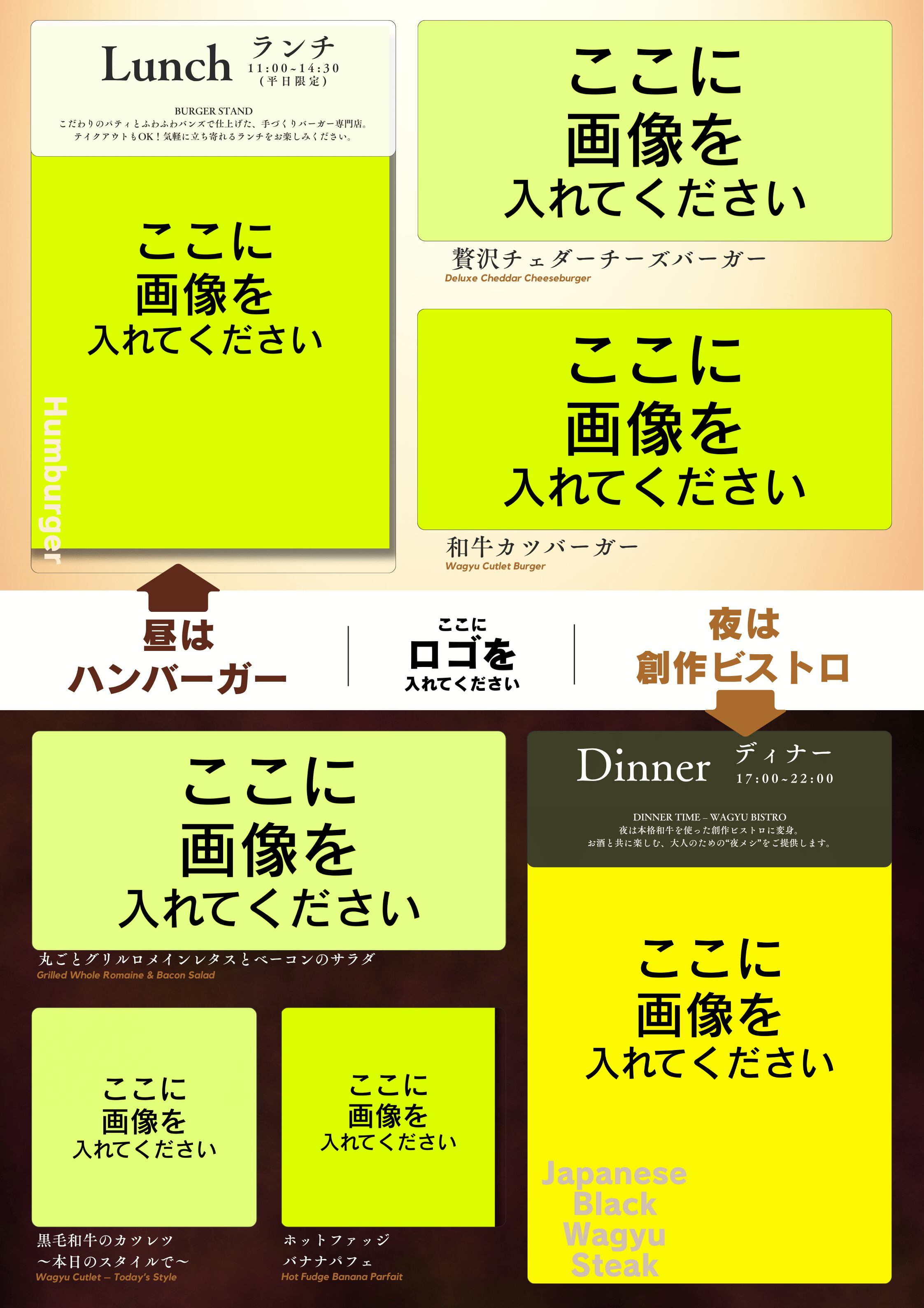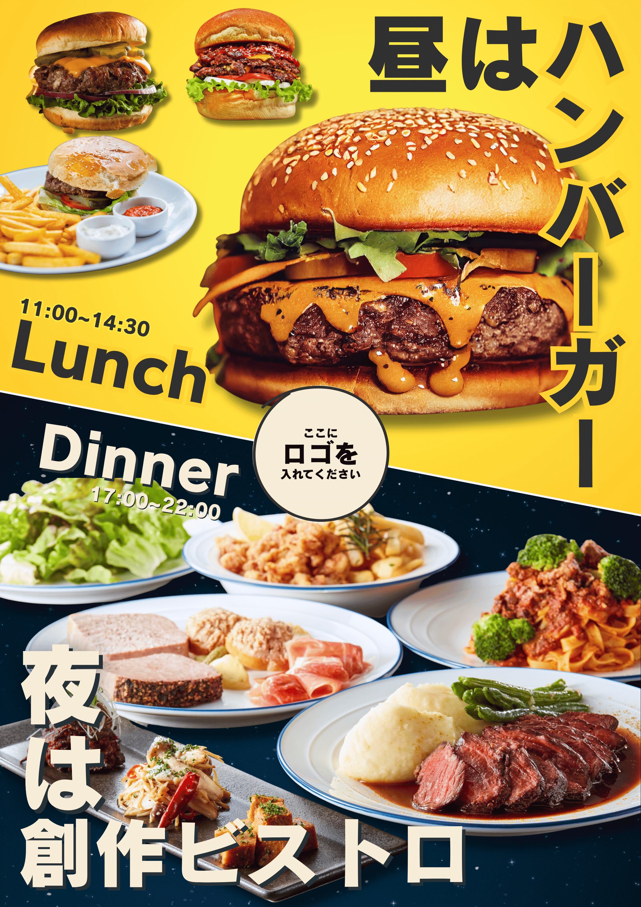 二部制営業・ランチ/ディナー両対応のA1看板テンプレート(Vol.1) です。