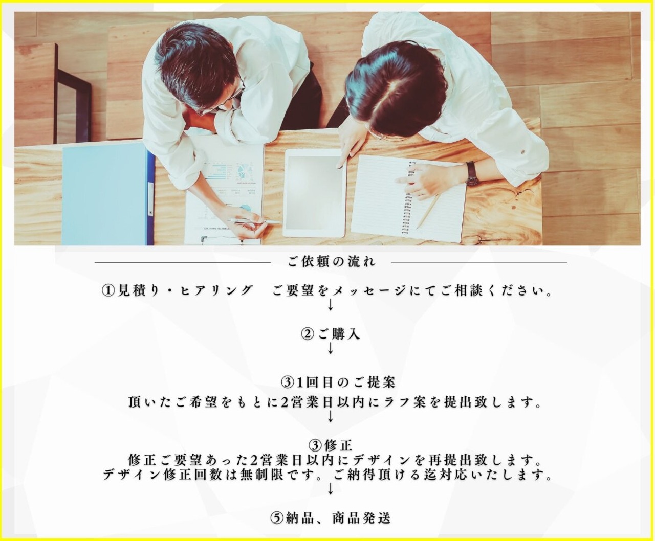 頂いたご希望をもとに2営業日以内にラフ案を提出致します。