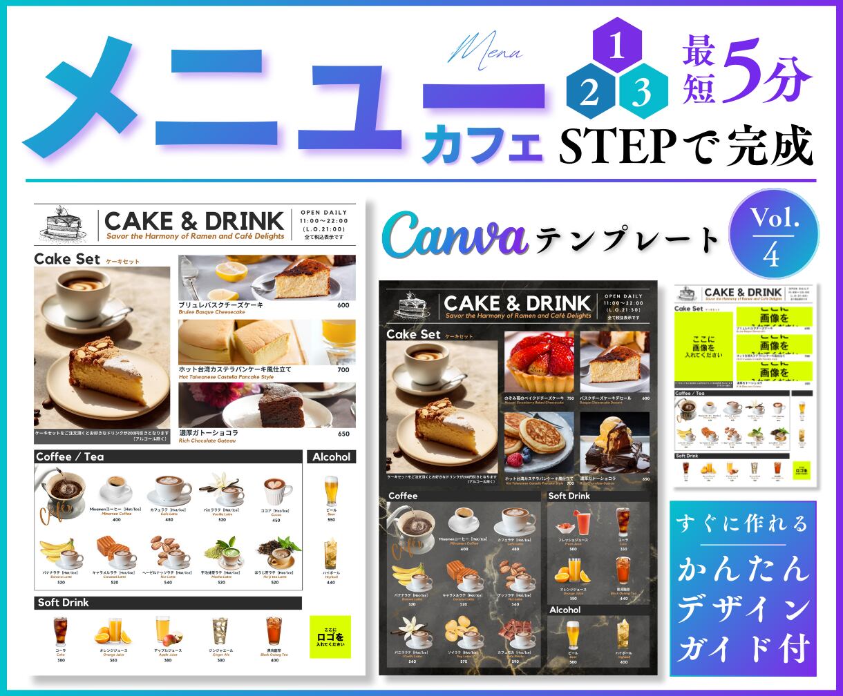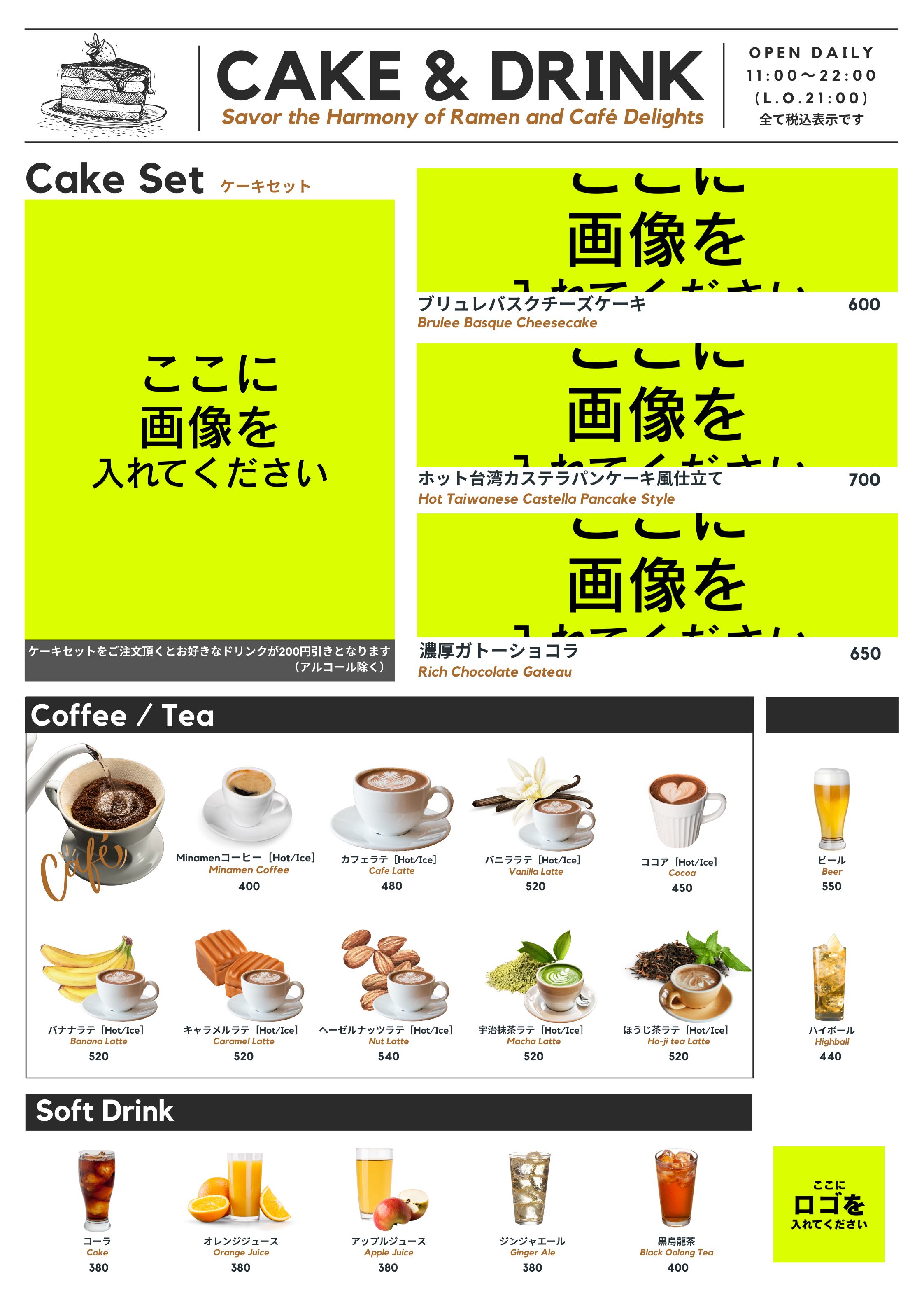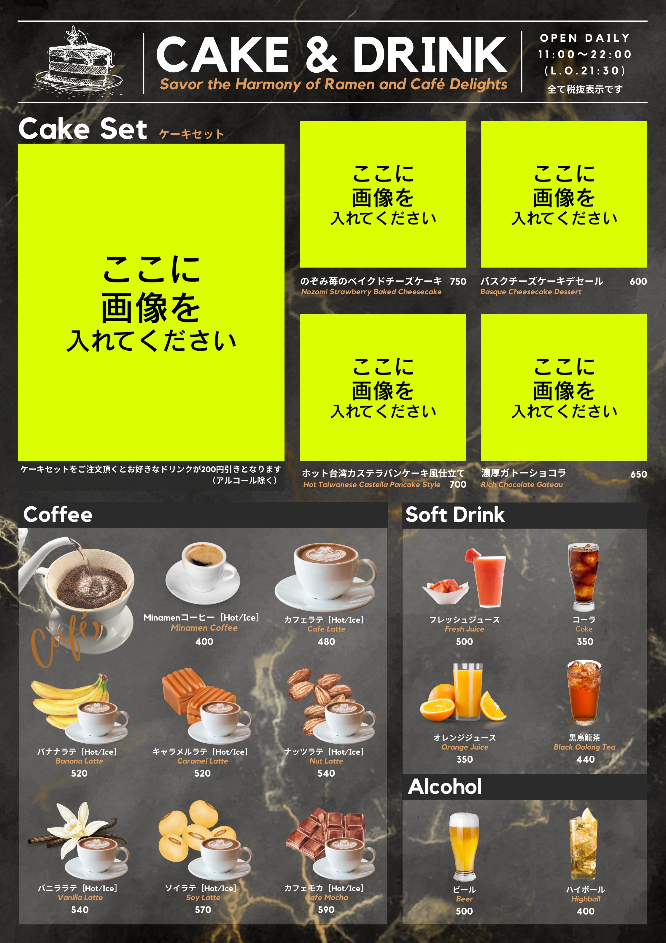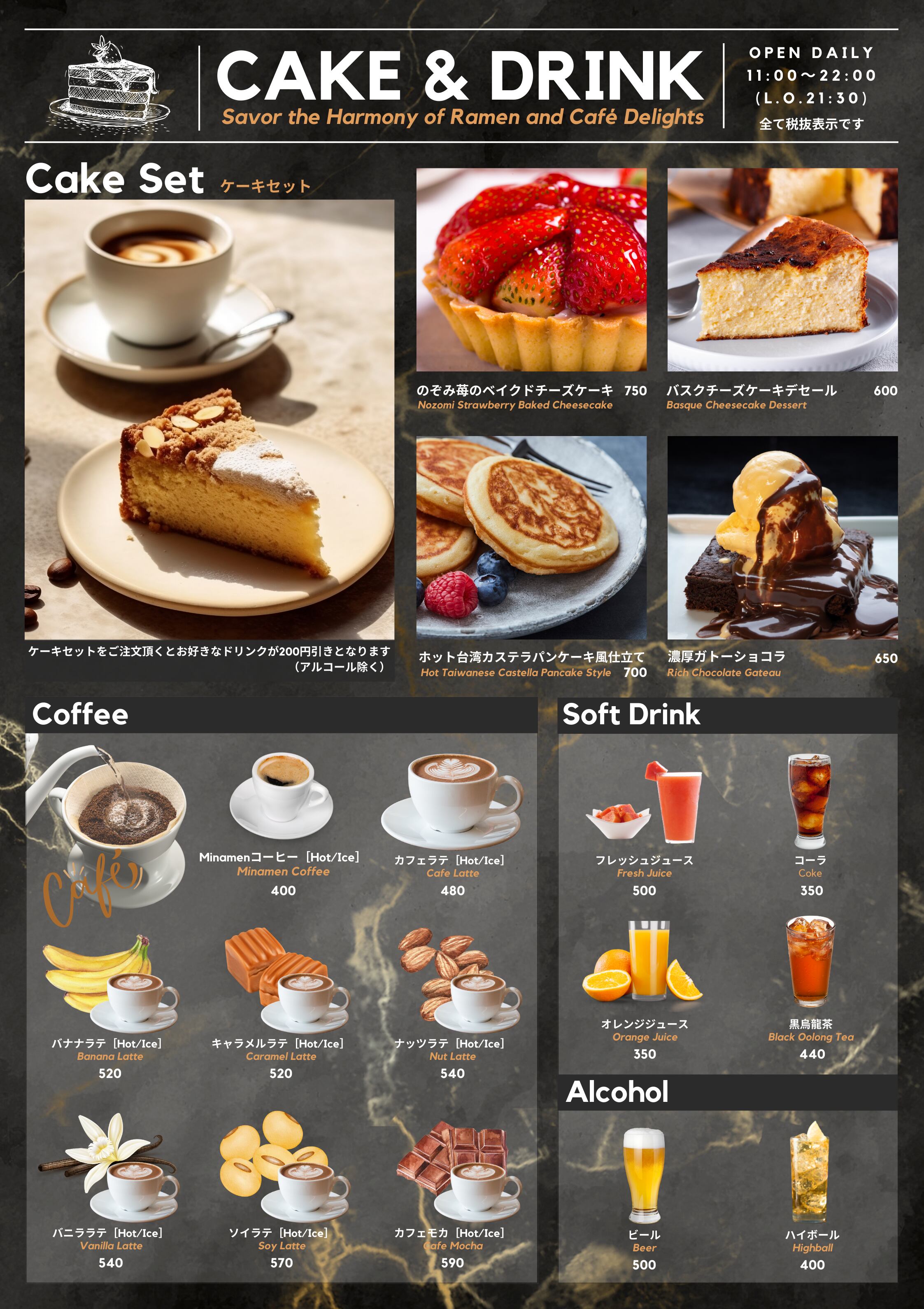 ケーキセット・ドリンクメニュー・カフェラテ・ソフトドリンク・アルコールなど、